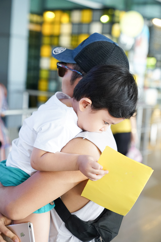Ra phi trường từ sớm nên Phan Hiển và con trai phải đứng đợi khá lâu.