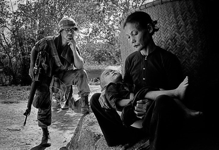 Lính Mỹ quan sát một cụ bà bế trên tay đứa cháu nhỏ trong một cuộc càn quét ở Quảng Ngãi năm 1967. Ảnh: Philip Jones Griffiths/ Magnum.