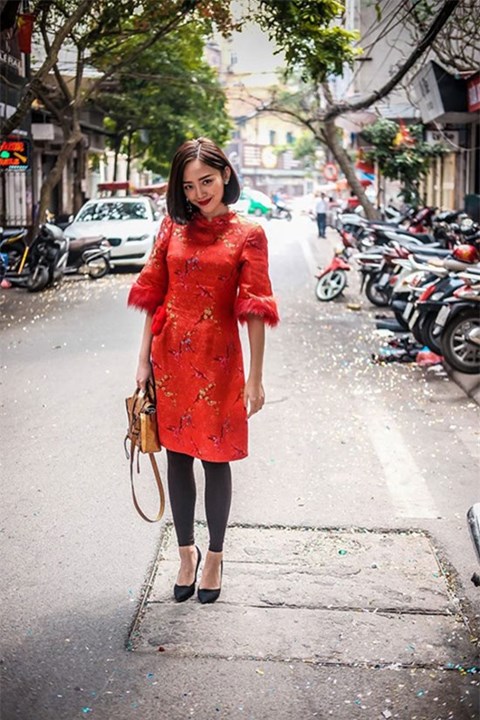 Khác hẳn những lúc ăn vận hở hang, Tóc Tiên trở nên đẹp dịu dàng và "e ấp" trong chiếc áo dài cách tân, họa tiết hoa mai vàng.