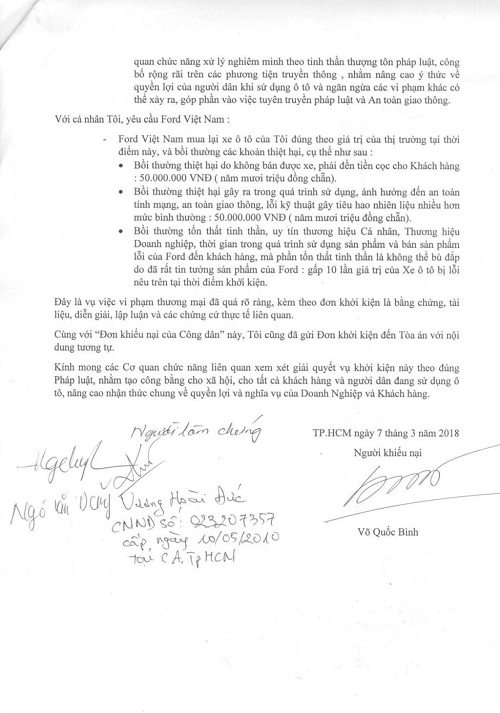 Anh đồng thời gửi đơn này đến các Hội Bảo vệ Người tiêu dùng TP.HCM, Hội Bảo vệ Người tiêu dùng Việt Nam, Bộ Công Thương, Bộ Giao thông Vận tải. Nguyên nhân khởi kiện được anh Bình cho biết do chiếc Ford Focus bị lỗi hộp số, nhưng không nhận được bảo hành thỏa đáng từ đại lý Ford tại TP.HCM.