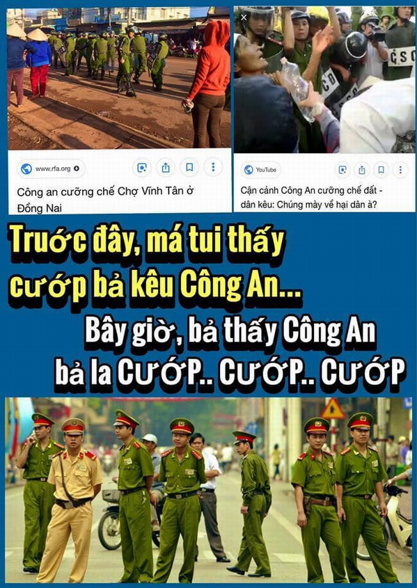 Vietbf.com Tư bản huấn luyện chó làm cảnh sát, còn CS huấn luyện cảnh sát làm gì? Đi nhiều nơi trên lãnh thổ Việt Nam, mọi người đều thấy treo giăng câu khẩu hiệu “sống và làm việc theo Hiến pháp và pháp luật”. Người nghĩ ra nó chắc không ngoài mục đích nhắc nhở mọi người trong xã hội phải tuân thủ pháp luật. Riêng cán bộ, công chức, đảng viên còn phải thực hiện “Học tập và làm theo tư tưởng, đạo đức, phong cách Hồ Chí Minh” nữa!