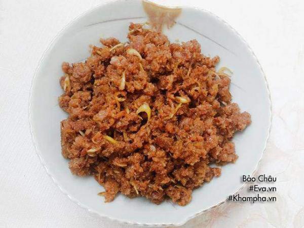 Thịt băm nhỏ ướp cùng chút gia vị cho ngấm. Sả, hành tỏi băm nhỏ. Phi thơm hành, tỏi, sả đến khi có mùi thơm và se lại thì cho thịt băm vào đảo đều tay. Khi thịt chín, tiếp tục đảo đều, để thịt săn lại thì cho 2 thìa mắm tép vào rồi đảo đều cùng thịt. Để thịt trên bếp thêm 3 đến 5 phút thì tắt bếp.
