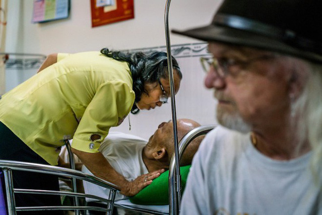 Tháng 9/2015, một phụ nữ 64 tuổi ngồi cạnh người chồng nằm liệt giường của bà ở làng Mỹ Luông, Đồng bằng sông Cửu Long.