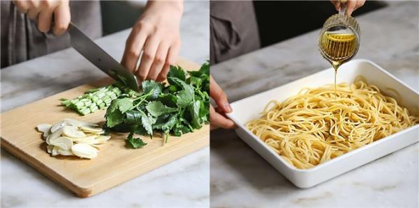 Tỏi bóc vỏ thái lát. Rau cần tây rửa sạch, phần cuống thái khúc dài 2cm, phần lá thái khúc dài 6cm. Cho 2 lít nước vào nồi cùng chút muối đun sôi sau đó cho mì vào luộc chín trong khoảng 5 phút. Vớt mì ra rồi trộn với một ít dầu oliu cho tơi.