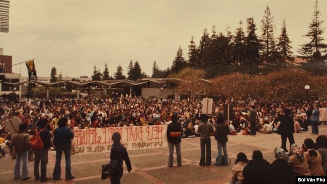 Biểu tình cho thuyền nhân Việt Nam tại Sproul Plaza năm 1979. (Ảnh: Bùi Văn Phú)