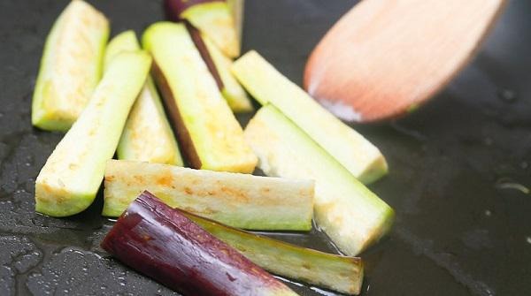 - Bước 3: Cho cà tím vào chảo dầu và chiên cho đến khi phần lõi thịt cà tím hơi vàng. Sau khi chiên, vớt cà ra để cho ráo dầu.