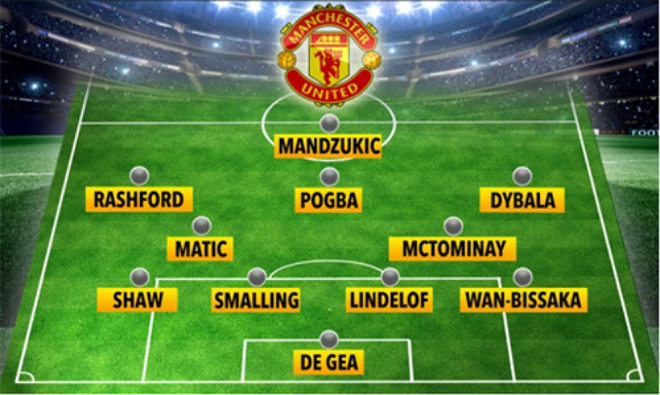 Trong sơ đồ 4-2-3-1 đang được ưa chuộng, Solskjaer sẽ có đội hình ưng ý nhất. Đầu tiên là mũi nhọn Mandzukic trên hàng công. Hỗ trợ cho tiền đạo người Croatia là Rashford, Pogba và Dybala.