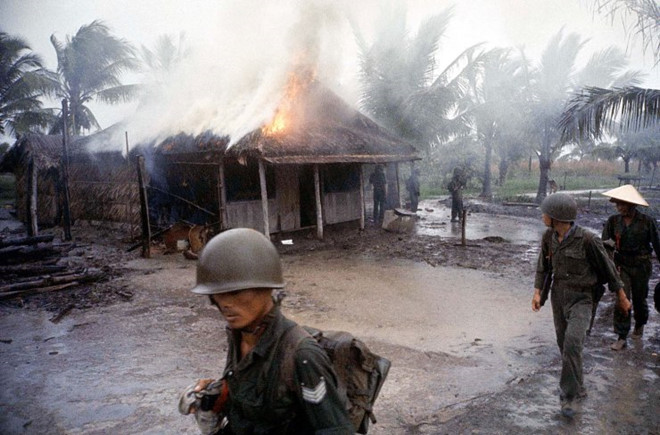 Lính VNCH đốt mái nhà tranh trong một trận càn. Đây là dạng nhà phổ biến của nông dân Việt Nam ở những vùng nông thôn phía nam.