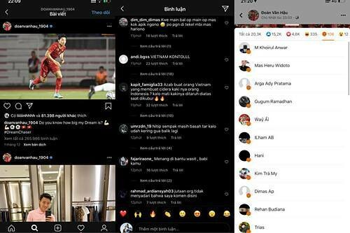 Trong khi đó, cổ động viên Việt Nam cũng bắt đầu vào trang cá nhân của Đoàn Văn Hậu để đáp trả các comment từ cổ động viên Indonesia. Nhiều người còn kêu gọi bảo vệ trang cá nhân của Hậu.