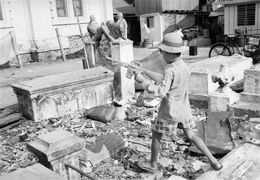 Trẻ ẻm chơi đùa với súng nhựa ở khu nghĩa địa không có người chăm nom, tràn ngập rác. Mả Lạng vốn là một nghĩa trang Công giáo có từ thời Pháp thuộc, bị bỏ hoang từ năm 1954. Người nghèo và dân tỵ nạn chiến tranh đã về đây cư ngụ, tạo nên một khu ổ chuột giữa trung tâm Sài Gòn.