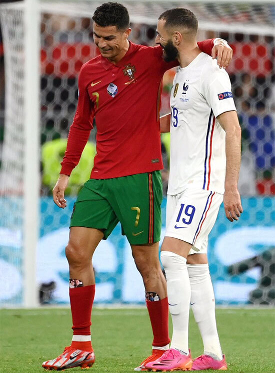 Trước đó, C. Ronaldo để lộ tấm lót ống quyển đặc biệt trong trận đấu cuối cùng vòng bảng với tuyển Pháp khi đang trò chuyện với đồng đội cũ ở Real là Karim Benzema lúc rời sân. Tấm lót ở bên chân còn lại dường như là ảnh chụp 4 đứa con của anh.