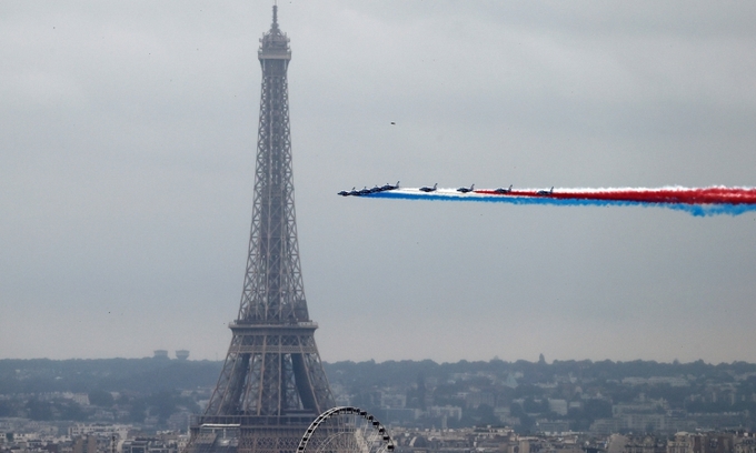Màn trình diễn của máy bay không quân Pháp gần tháp Eiffel hôm 14/7. Ảnh: Reuters.