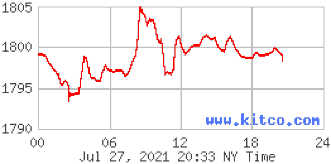 Trên thế giới, lúc 7h30 sáng nay (28/7), giá vàng giao ngay tại châu Á qua niêm yết của Kitco.com có biên độ tăng nhẹ, giao dịch ở mức 1.799 USD/ounce.