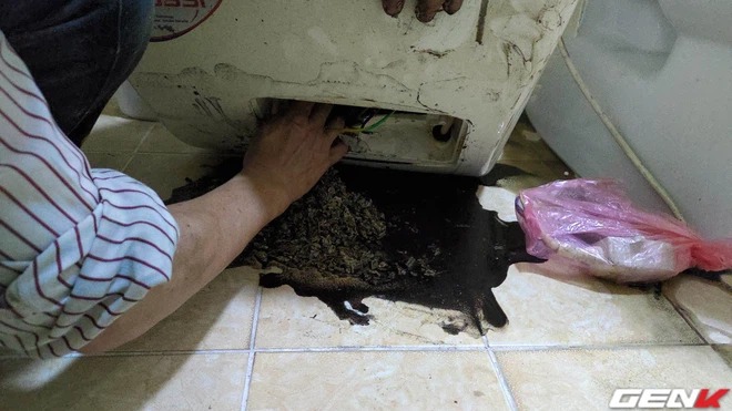Lúc này bình nóng lạnh thứ 2 cũng đã xả hết nước và được hạ xuống. Bình này cũng được sản xuất vào quý I năm 2008 như bình kia, và về độ bẩn thì cũng không hề thua kém, thậm chí còn có phần nhiều nước đen hơn.