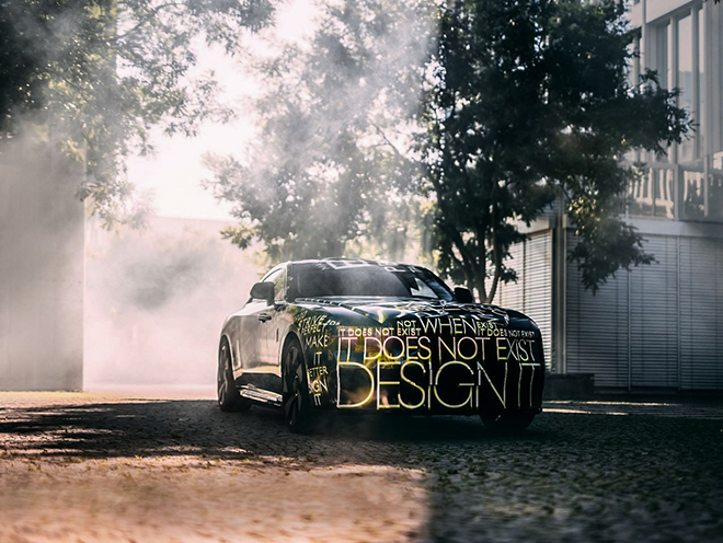 Lớp dán ngụy trang của Rolls-Royce Spectre có những dòng chữ tưởng chừng vô nghĩa nhưng thực ra chúng là những câu nói của người đồng sáng lập Rolls-Royce: ‘when it does not exist, design it’, có nghĩa là ‘khi một thứ gì đó không tồn tại, hãy tạo ra nó’.