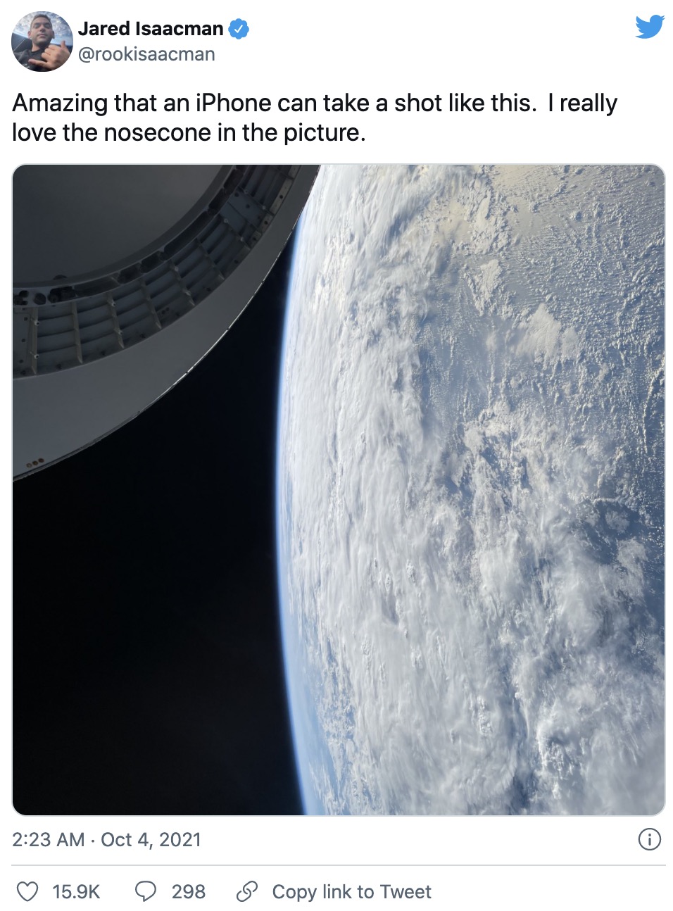 Thiết kế đặc biệt của tàu Crew Dragon đã giúp mang đến tầm nhìn tuyệt vời. Phi hành đoàn Inspiration4 của SpaceX đã bắt đầu chia sẻ một số hình ảnh và video được chụp từ không gian trong chuyến du hành dân sự vào quỹ đạo đầu tiên trên thế giới vào tháng trước. Một vài hình ảnh đầu tiên do SpaceX chia sẻ được chụp bằng máy ảnh DSLR Nikon, nhưng những hình ảnh được chia sẻ trong gần đây nhất của chỉ huy, tỷ phú Jared Isaacman lại được chụp bằng iPhone 12.
