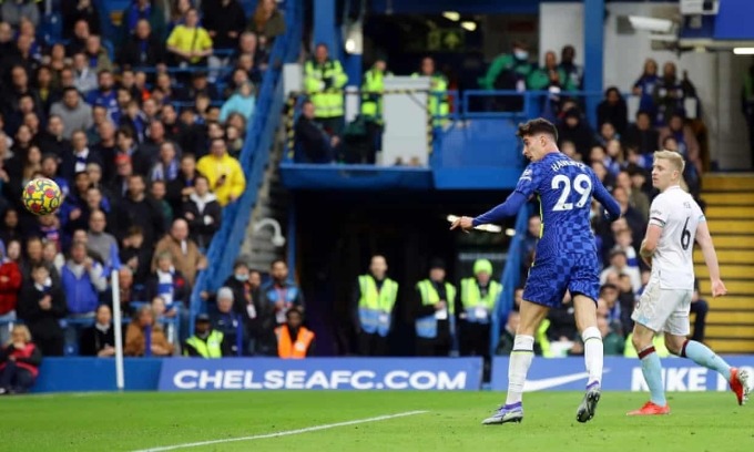 Chelsea áp đảo toàn diện trong hiệp một với 11 pha dứt điểm, còn đội khách chỉ một lần sút bóng. Chủ nhà cũng giữ bóng tới 72% thời lượng, và bàn mở tỷ số đến như lẽ tất yếu. Phút 33, Reece James tạt bóng như đặt vào cho Kai Havertz đánh đầu lái bóng về góc xa. Không hậu vệ nào của Burnley bám theo Havertz trong pha bóng này, còn đường bóng bay quá cho thủ môn Nick Pope có thể bắt được.