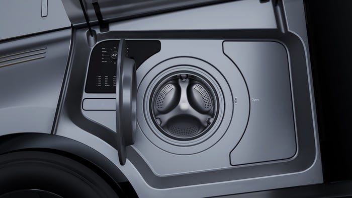 Phía sau một cửa sập ở phía bên của xe có một máy giặt nhỏ.