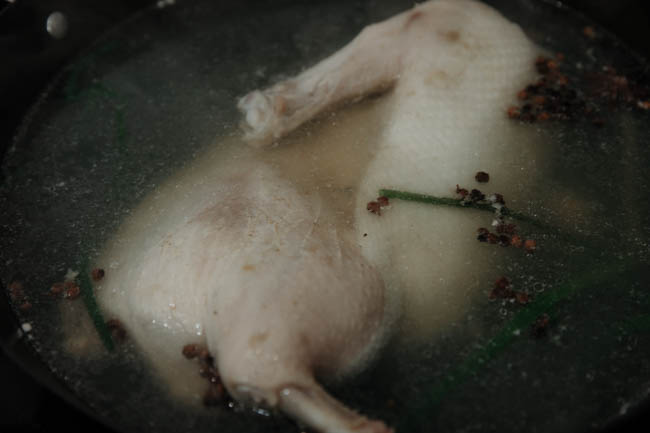Cho lượng nước vừa đủ vào nồi lớn (mực nước ngập mặt vịt), thêm gừng, hành lá và rượu nấu ăn. Đun nước sôi rồi cho vịt vào luộc, hạ nhỏ lửa để nước không sôi mạnh, không đậy nắp, nấu trong 10 phút. Tiếp theo đậy vung, tắt lửa, ngâm vịt trong 20 phút. Sau đó, bật lửa đợi nước sôi lại, rồi lại tắt bếp ngâm thêm 20 phút nữa.