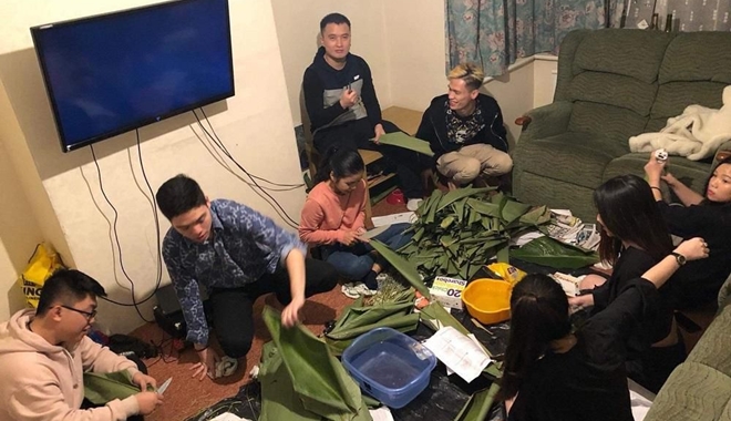 Du học sinh Việt gói bánh chưng đón Tết ở Anh.