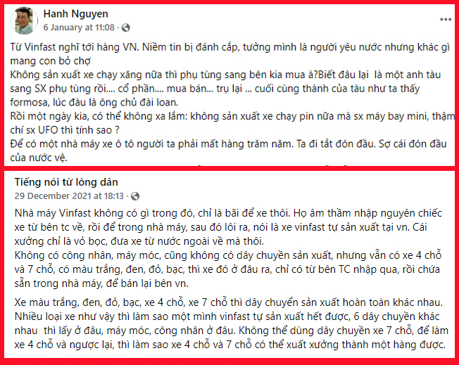 Còn VINFAST tại Việt Nam, với một nhà máy lắp ráp ôtô đầu tiên tại Việt Nam thành lập vào Tháng Sáu 2017, nó chỉ là một dây chuyền lắp ráp ôtô, phụ kiện nhập khẩu hoàn toàn ở các nước khác, còn hiện tại ở nước ta chưa sản xuất được một ốc vít đạt tiêu chuẩn chất lượng cao. Một nhà máy lắp ráp ôtô mới được bốn năm thế mà nổ to hơn đại bác, tuyên rằng VinFast dừng sản xuất xe xăng vào cuối năm 2022 sẽ trở thành hãng xe điện 100%, là hãng ôtô Việt trở thành một trong những hãng xe tiên phong trên thế giới ngừng sản xuất xe xăng để chuyển sang sản xuất xe thuần điện, và vượt qua nhiều hãng xe auto ở các nước văn minh phát triển trên thế giới như Mỹ, Đức, Pháp, Nhật v.v.