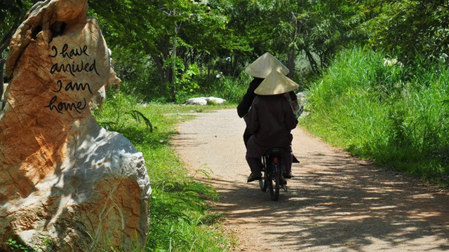 Để chắc chắn rằng không ai có thể bỏ lỡ nó, thông điệp ấy được viết bằng chữ thư pháp tuyệt đẹp (di sản của chính Thích Nhất Hạnh) trên một tảng đá cảnh lớn, được đặt ở vị trí quan trọng giữa ký túc xá nữ và thiền đường. Tôi đã đi qua nó vô số lần mỗi ngày, và tôi không bao giờ cảm thấy phiền khi dừng lại và đắm mình trong sự bình yên sâu sắc mà thông điệp đơn giản này đã mang lại cho tôi.