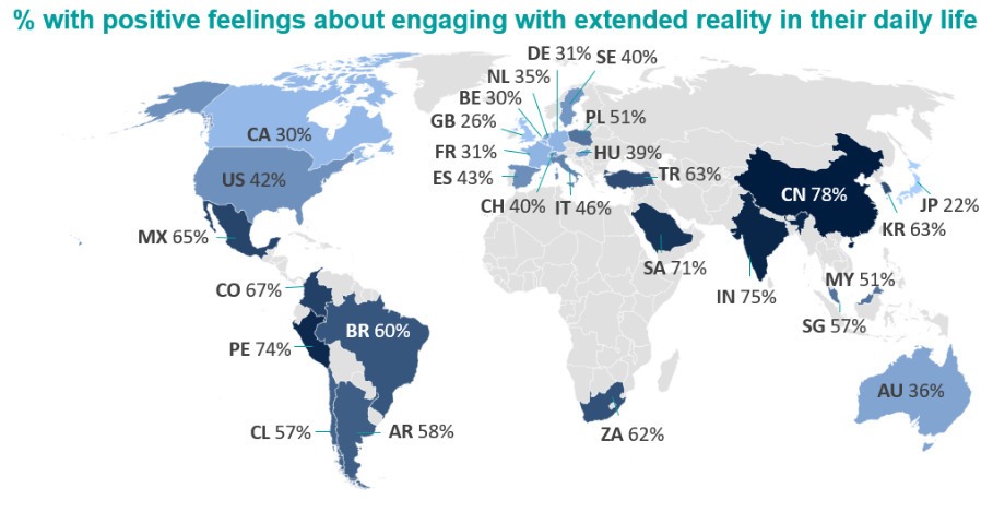 Trong khi đó, tỷ lệ người không đặt niềm tin vào metaverse chủ yếu là ở các nước phát triển. Nhật Bản thấp nhất với chỉ 22% thể hiện cảm xúc tích cực cho vũ trụ ảo, tiếp theo là Anh 26%, Bỉ 30%, Canada 30%, Pháp 31% và Đức 31%.