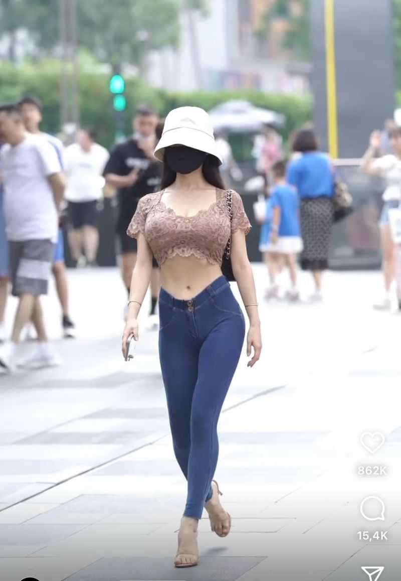 Mới đây, trên một tài khoản tiktok đăng tải khoảnh khắc cô gái Hàn Quốc che kín mặt nhưng mặc đồ chưa tinh tế. Theo đó, cô chọn kết hợp một chiếc áo croptop màu nude với quần legging kiểu dáng denim. Thiết kế ôm sát cơ thể, lộ đường cong mềm mại. Theo chuyển động của bước chân, cô gái trở nên quyến rũ hơn, hút mọi ánh nh́n.