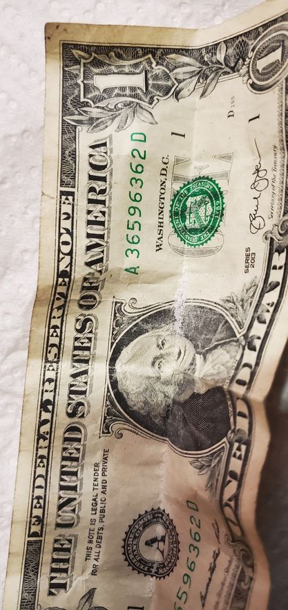 She noticed a folded ONE DOLLAR BILL on the pavement in front of the store.