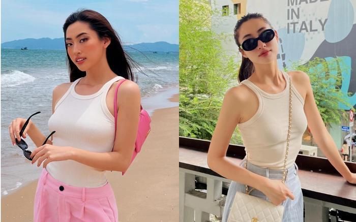 Dù là nàng Hậu nổi tiếng nhưng Lương Thùy Linh rất chăm diện lại đồ cũ. Mẫu áo không tay này cũng được cô sử dụng nhiều lần. Có khi nàng Hậu mix áo với quần vải tông hồng trẻ trung, có khi cô lại mix áo với quần tông xanh nhẹ nhàng.