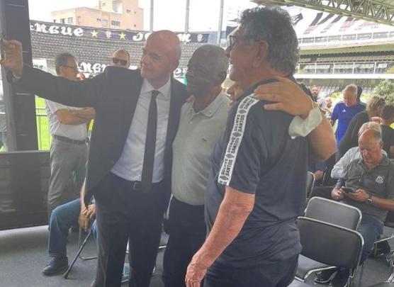 Chủ tịch FIFA Gianni Infantino cầm điện thoại chụp cùng các đồng đội cũ của Pele.