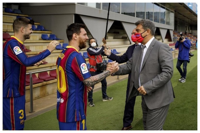Messi bắt tay Chủ tịch Joan Laporta khi còn khoác áo Barca mùa 2020-2021. Ảnh: AP.