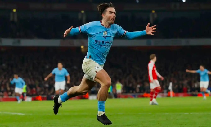 Grealish mừng bàn nâng tỷ số lên 2-1 cho Man City trước Arsenal trên sân Emirates, Bắc London ở trận bù vòng 12 Ngoại hạng Anh tối 15/2/2023. Ảnh: Guardian