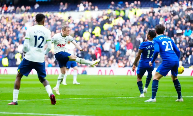 Cú sút xa thành bàn mở tỷ số của Oliver Skipp, trước Chelsea trên sân Tottenham Hotspur ở vòng 25 Ngoại hạng Anh hôm 26/2/2023. Ảnh: Shutterstock
