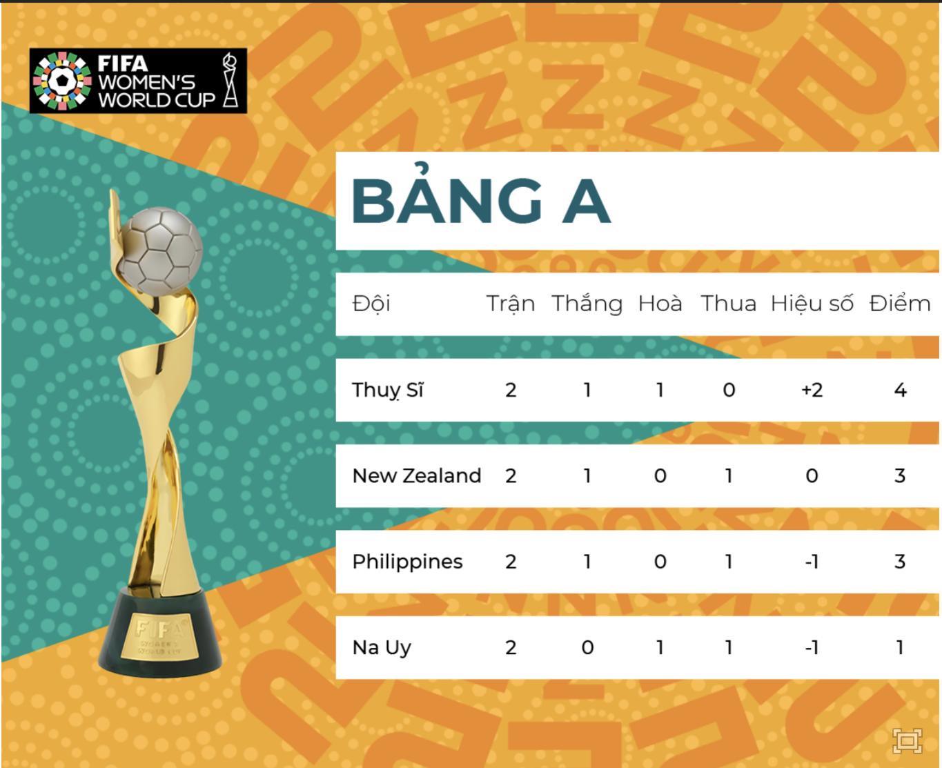 Cục diện bảng A World Cup nữ 2023 trở nên vô cùng hấp dẫn sau những kết quả ở lượt trận thứ hai diễn ra vào ngày 25/7. Với thắng lợi 1-0 trước New Zealand, Philippines có 3 điểm, tạm xếp thứ 3 do kém đội chủ nhà hiệu số bàn thắng.