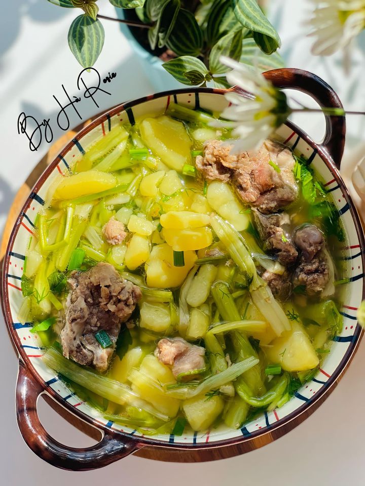 Một bát canh rau cần nấu khoai tây với nước canh trong, béo ngọt, khoai tây mềm, bở, rau cần chín tới, giòn, ngọt. Và thơm nồng vị tiêu, hành lá. Món canh này có thể ăn không hoặc ăn với cơm nóng.