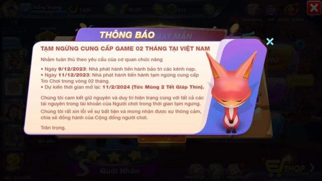Sáng nay 9.12, nhiều người chơi game bất ngờ khi nhận được thông báo các trò chơi của VNG gồm Tú Lơ Khơ, Poker Việt Nam, Crazy Tiến Lên, Tiến Lên miền Nam, Cờ Cá Ngựa, Cờ Tướng thông báo ngừng cung cấp. Cụ thể, từ ngày 9.12 sẽ tiến hành bảo trì các kênh nạp tiền, ngày 11.12 sẽ tạm ngừng cung cấp trò chơi trong vòng 2 tháng. Anh Trương Ngọc Thắng, một người chơi tại Nha Trang (Khánh Hòa) chia sẻ: "Tôi chơi game không thường xuyên, thỉnh thoảng mới nạp ít tiền để đánh cờ tướng online, nhưng hôm nay nghe thông báo game tạm ngừng cảm thấy khá hoang mang, số tiền nạp vào không nhiều nhưng cộng đồng những người chơi game này rất lớn, nếu ngừng sẽ có rất đông người bị ảnh hưởng".