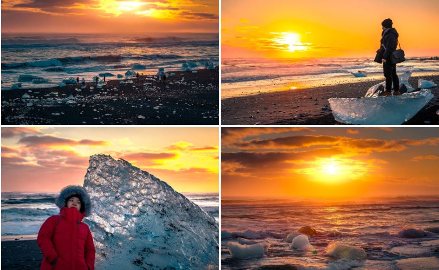 Dưới ánh nắng chiều, những tảng băng trông như viên kim cương lấp lánh trên nền cát đen.