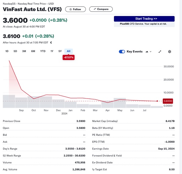 Vào phiên giao dịch cuối tháng 8, cổ phiếu Vinfast đã xuống 3.6$, thậm chí có lúc đã rớt xuống 3.5$.