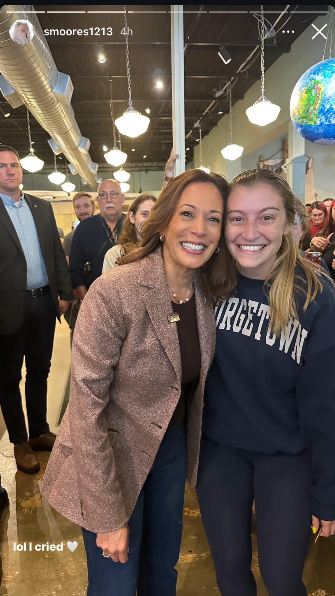 Những người tình cờ ôm Kamala ứa lệ là các nhân viên làm việc cho ban vận động bầu cử của Kamala. Chị ứa lệ 3 hàng chụp hình chung với Kamala là Stephanie Moore luật sư đang làm trong ban vận động của Kamala.