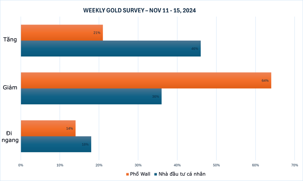 Khảo sát của Kitco News cho biết trong 14 nhà phân tích được hỏi có đến 9 người (64%) dự đoán giá vàng tiếp tục đi xuống vào tuần tới. Chỉ 3 chuyên gia (21%) kỳ vọng giá tăng và 2 nhà người (14%) giữ quan điểm trung lập.