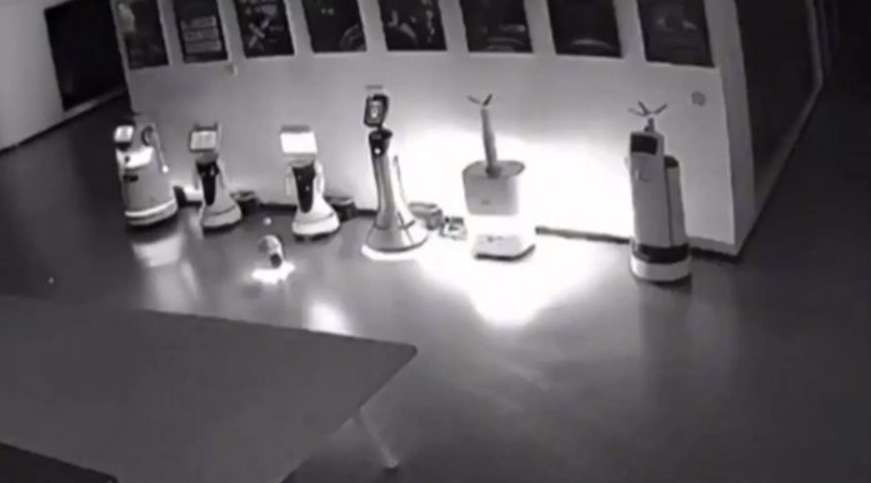 Đoạn video giám sát, được ghi lại vào một đêm tháng 8 nhưng chỉ mới được công bố gần đây, cho thấy một con robot màu trắng có tên mã là Erbai đang tiến đến gần một số robot lớn hơn được đặt cạnh một bức tường trong hội trường triển lãm.