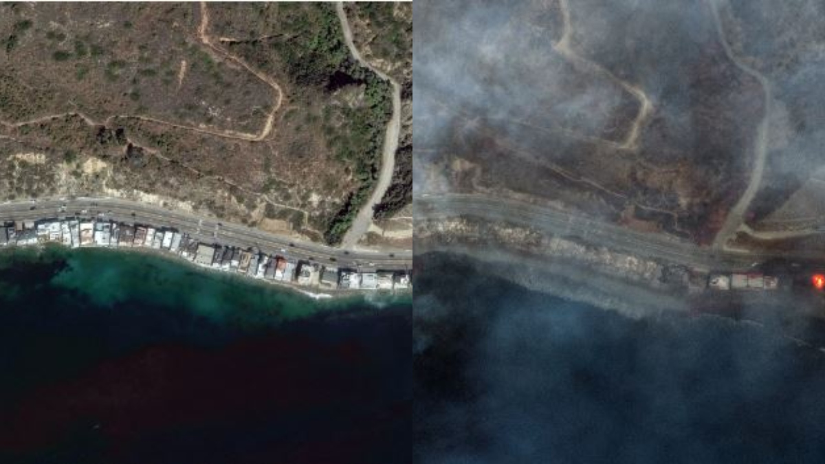 Hình ảnh vệ tinh từ Maxar Technologies đã cho thấy mức độ tàn phá khủng khiếp tại khu vực Malibu. Đường Tuna Canyon gần như bị xóa sổ hoàn toàn. Khói dày đặc bao phủ khu vực từ Malibu Coast đến Santa Monica, kéo dài đến Beverly Hills, khiến cơ quan chức năng phải ban hành cảnh báo về chất lượng không khí.