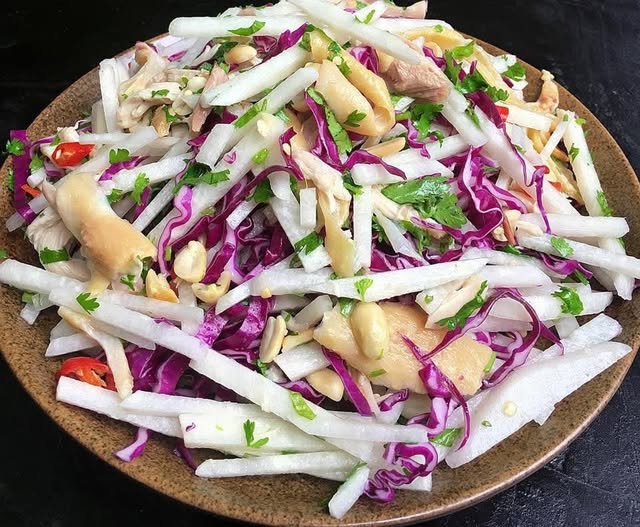 - Bây giờ đến cách trộn nộm: cho củ đậu,gà xé hoặc thái nhỏ vào một cái âu to,thêm bắp cải tím thái mỏng nếu thích,đổ nước cốt mắm chua ngọt ở trên vào xóc đều,hoặc đi bao tay vào trộn đều vì củ đậu lúc này rất giòn nên các bạn nhớ trộn nhẹ tay để tránh củ đậu vị gẫy nát nhé.Nêm nếm vừa miệng các bạn thêm rau mùi,lạc rang rắc lên trên (mình cho khoảng 3 thìa canh nước cốt mắm chua ngọt dùng để trộn nộm)