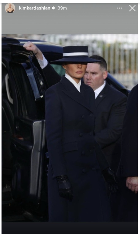 Theo New York Post, Kim Kardashian gây xôn xao mạng xã hội khi đăng bức ảnh Đệ nhất phu nhân Melania Trump đội mũ rộng vành trong lễ nhậm chức Tổng thống Mỹ của ông Donald Trump vào ngày 20/1.