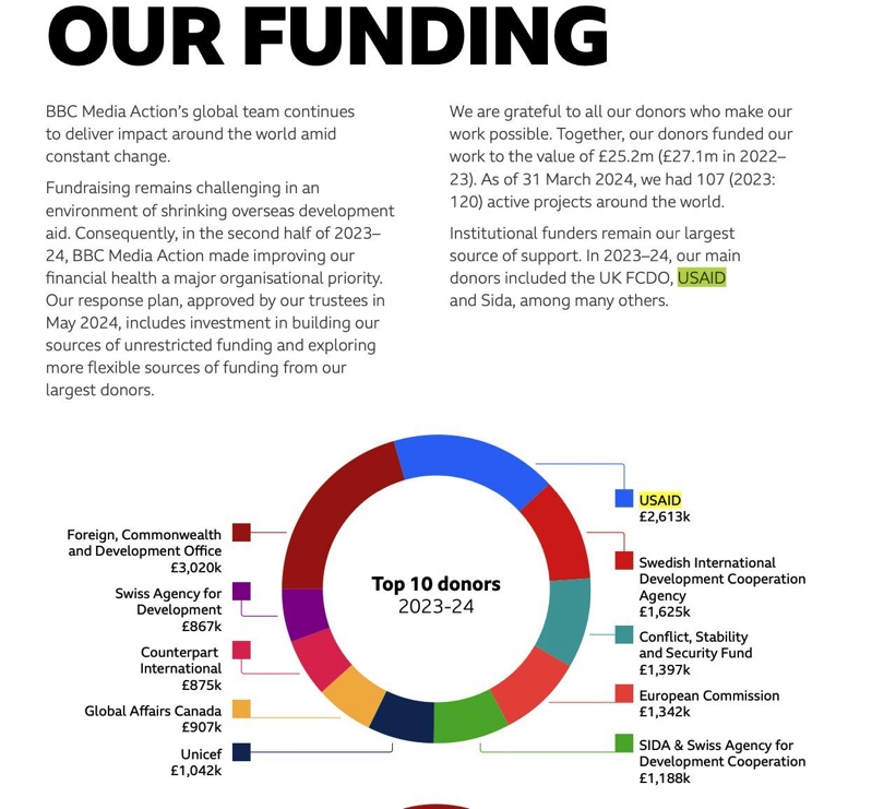 BBC Media Action, một tổ chức từ thiện gắn liền với BBC, đã nhận được 3,3 triệu đô la từ USAID trong năm 2023-24, khiến cơ quan Hoa Kỳ này trở thành một trong những nhà tài trợ hàng đầu của mình.