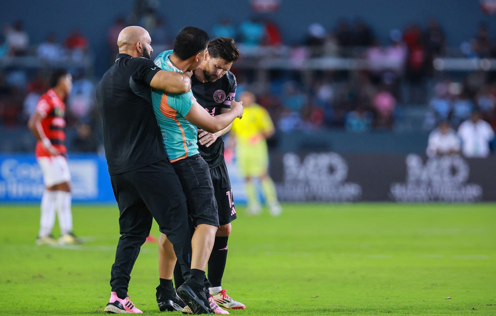 Old  Default Lao vào sân ôm Messi nhưng bị vệ sĩ "bất bại" chặn lại, fan quá khích có hành động không ngờ