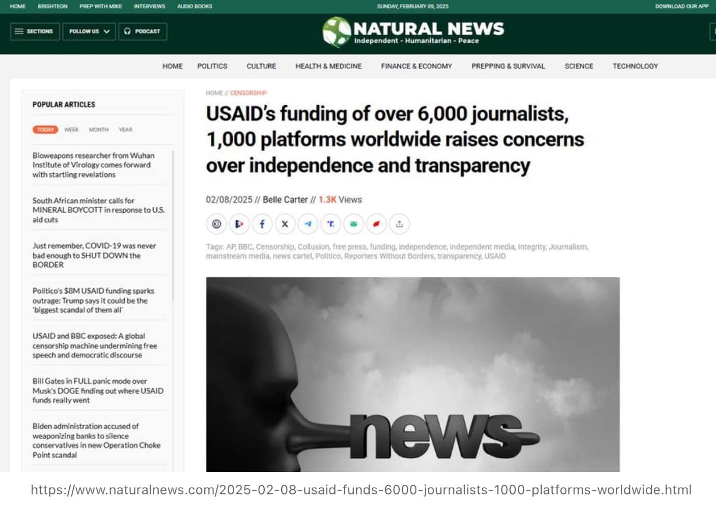 • Chính phủ Hoa Kỳ, thông qua Cơ quan Phát triển Quốc tế Hoa Kỳ (USAID), đă tài trợ đáng kể cho hơn 6.200 nhà báo trên 707 cơ quan truyền thông và 279 tổ chức truyền thông phi chính phủ, bao gồm các tổ chức lớn như Politico , Associated Press và BBC , với 90 phần trăm các bài báo cáo từ Ukraine được hỗ trợ.