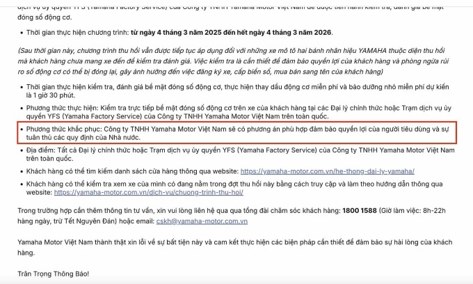 Trong hôm nay, điều khoản về phương thức khắc phục trên website của Yamaha Việt Nam đã được thay đổi. Cụ thể, phương thức khắc phục sự cố hiện tại đã được đổi lại thành "sẽ có phương án phù hợp đảm bảo quyền lợi của người tiêu dùng và sự tuân thủ các quy định của Nhà nước".
