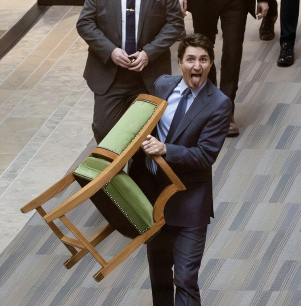 Theo Reuters, trong khoảnh khắc gây chú ý, Thủ tướng Canada Justin Trudeau bước ra khỏi Quốc hội với dáng vẻ hài hước - thè lưỡi và khệ nệ bê ghế. Hình ảnh này nhanh chóng lan truyền trên mạng xã hội, khiến nhiều người thích thú.